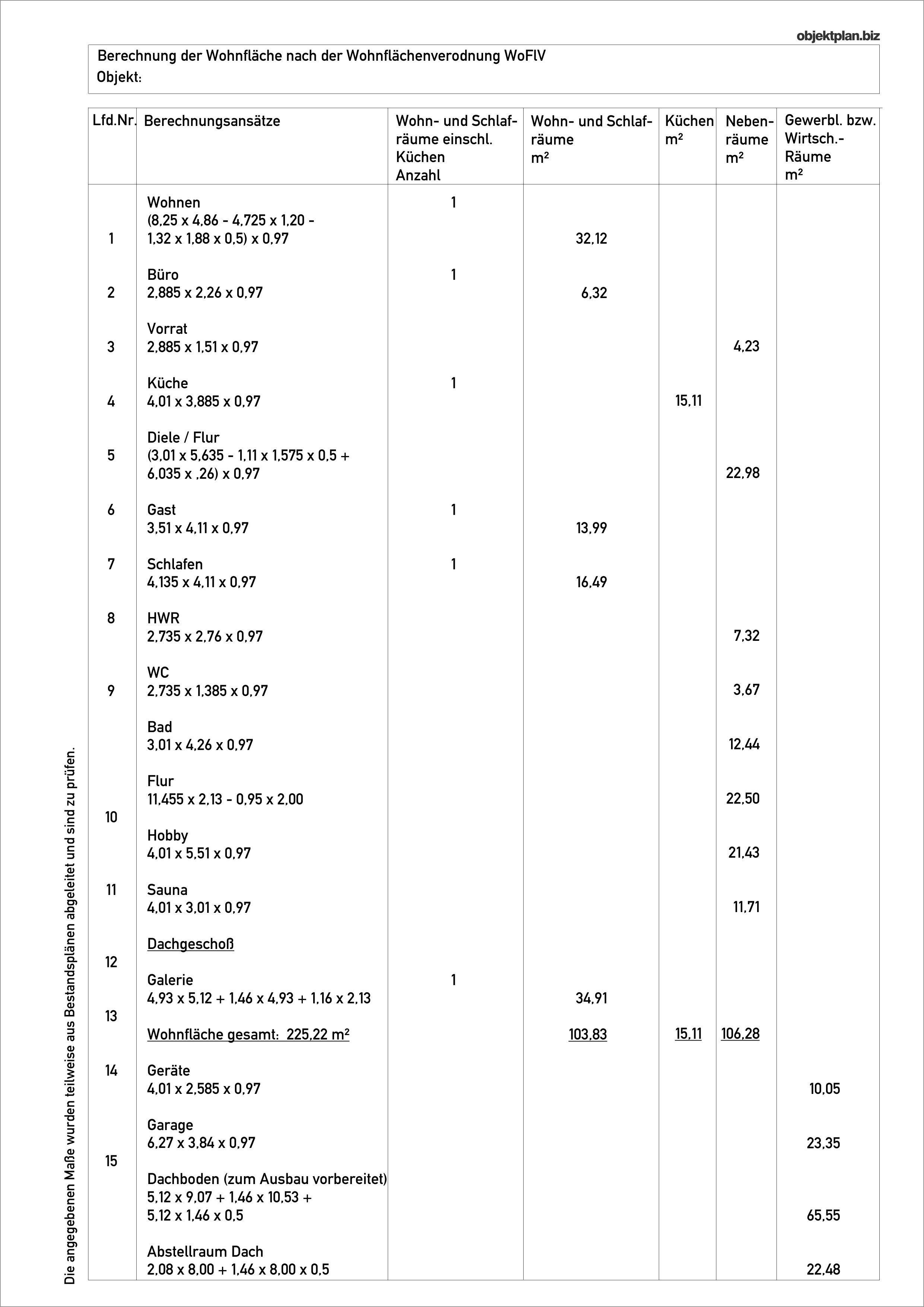 Flächenermittlung des Objektes nach Wohnflächenverordnung (WoFlV) oder nach DIN 277 auf Basis von Aufmaßen oder Bauzeichnungen